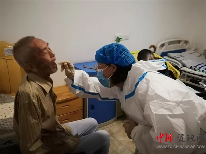 醫(yī)護人員首先為護理員工核酸檢測,隨后,在護理員的引導下,醫(yī)護人員分別到集中檢測房間為能夠行動的老人檢測取樣。集中采樣完成后,護理員又帶著醫(yī)務(wù)人員來到臥床不能自理的老人床前挨個進行采樣,安全有序的完成了104人的核酸檢測。