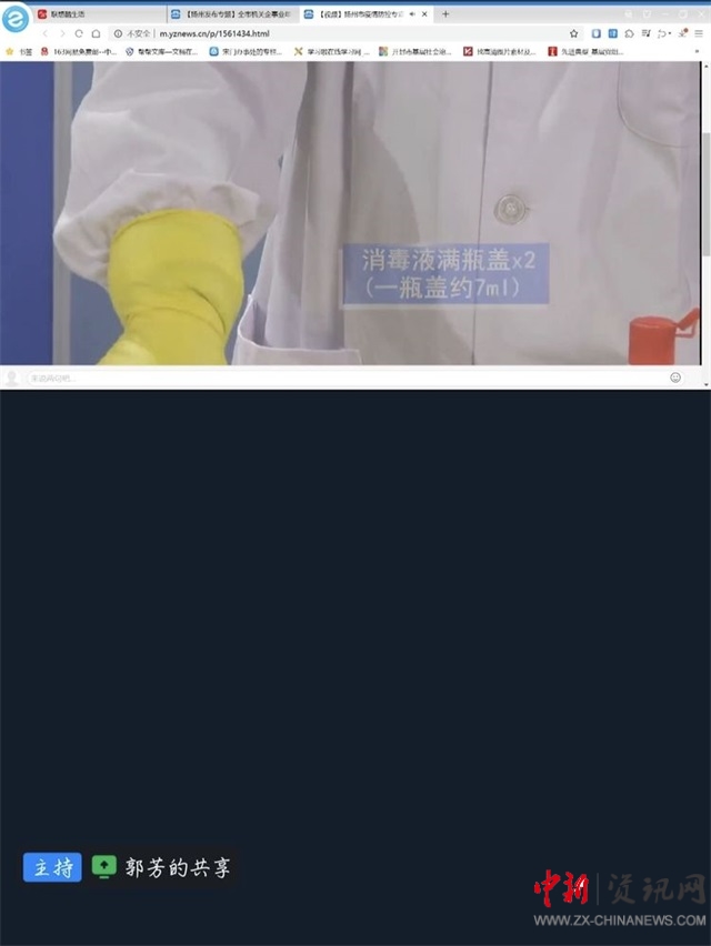 學(xué)習(xí)中,大家在微信群內(nèi)觀看“揚(yáng)州市疫情防控專項(xiàng)培訓(xùn):消毒液配比”科普視頻。自新冠肺炎疫情防控工作開展以來,宋門街道全體黨員干部積極爭(zhēng)當(dāng)防控“第一人”,沖在抗疫“第一線”,戰(zhàn)好服務(wù)“第一崗”,以擔(dān)當(dāng)精神和過硬作風(fēng),筑牢抗疫紅色堡壘。街道組宣統(tǒng)委員郭芳以“視頻對(duì)話”方式,向大家強(qiáng)調(diào):當(dāng)前疫情形勢(shì)依舊嚴(yán)峻,大家在做好疫情防控工作的同時(shí)要做好自身防護(hù)。