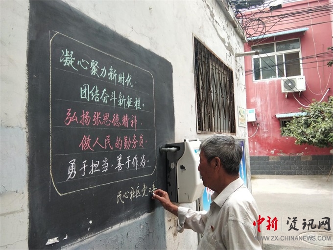 今年78歲的郭漢英寫得一手好字,退休后他發(fā)揮余熱,每月都在民心社區(qū)大街小巷的黑板上辦黑板報(bào),內(nèi)容包括黨的歷史、國(guó)防教育、防詐騙知識(shí)、環(huán)保知識(shí)等。