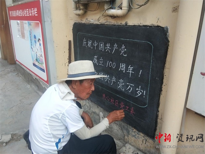 開封市順河回族區(qū)曹門街道民心社區(qū)老黨員手寫黑板報(bào)慶祝黨的百年華誕