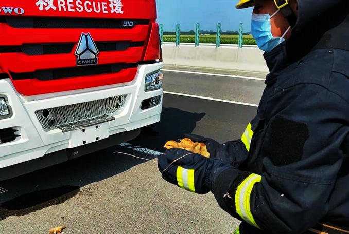 河南禹州:鄭欒高速一輛面包車起火 消防員滅火后幫雞崽“回家”