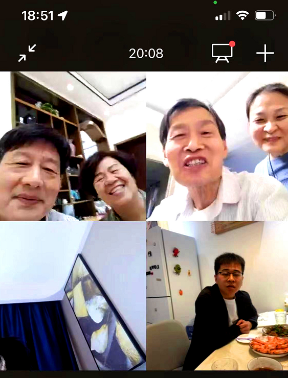 5.1國際勞動節(jié)晚八點,我們按照兒子和準兒媳的安排在微信上建立了我家、親家及孩子三方群。視頻打開后首先我和親家的線上“云”握手問好。視頻里三方各自拿出自家拿手好菜擺在餐桌上,我和親家拱手“云”酒一杯。接著,兒子、兒媳交換訂婚戒指,看到兒子與兒媳緊緊地幸福擁抱 ,作為父母心中的喜悅真是無法言表,真的像吃了蜜一樣。