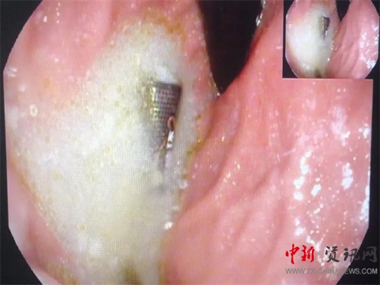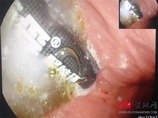 全身麻醉后,醫(yī)生龔靈輝操作胃鏡進(jìn)入孩子胃部,發(fā)現(xiàn)一節(jié)電池浸在胃液里。由于患兒年齡小,胃部體積也很小,長(zhǎng)達(dá)5cm的電池顯得特別巨大,同時(shí)胃鏡下的操作空間也很有限,為手術(shù)帶來(lái)了不小的麻煩。