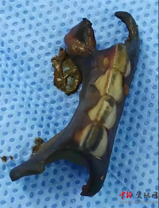 當(dāng)晚9點(diǎn)40分,廖新偉積極協(xié)調(diào),麻醉科手術(shù)部及輸血科密切配合,以劉大勇主刀、副主任醫(yī)師汪麗偉輔助,緊急為侯老太太施行了手術(shù)。打開(kāi)腹腔,驚人地發(fā)現(xiàn)侯老太太腹腔已被糞便填滿,腸子漲的像氣球那么大。術(shù)中,經(jīng)過(guò)沖洗并且減壓腸道后,醫(yī)護(hù)團(tuán)隊(duì)在直腸上段發(fā)現(xiàn)一大小約1.5cm破口,一堅(jiān)硬物嵌頓在破口處,打開(kāi)腸壁,一排帶鉤的假牙映入眼前。醫(yī)護(hù)人員將假牙小心翼翼地完整取出,足足有4cm長(zhǎng)。由于侯老太太腹腔污染嚴(yán)重,且腸梗阻時(shí)間較長(zhǎng),腸壁水腫十分嚴(yán)重,無(wú)法再次重建消化道,于是胃腸外科團(tuán)隊(duì)給老太太做了直腸遠(yuǎn)端封閉+乙狀結(jié)腸造口術(shù)?紤]到患者腹腔污染術(shù)后可能出現(xiàn)感染腹腔膿腫等情況,醫(yī)護(hù)團(tuán)隊(duì)給侯老太太左右上下總共放了5根引流管。