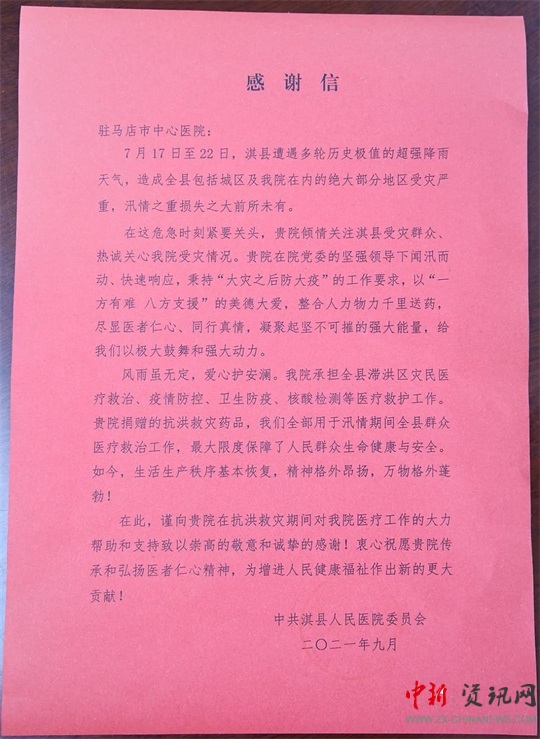 如今,受汛情影響地區(qū)已基本恢復(fù)生產(chǎn)生活秩序,淇縣人民醫(yī)院特送來錦旗和感謝信。