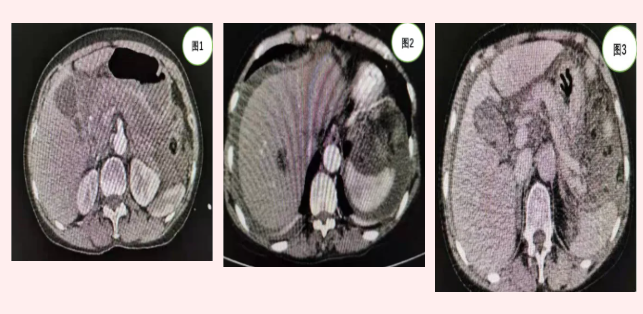 患者張某入院時(shí),急診行全腹CT(見圖1)等相關(guān)檢查發(fā)現(xiàn)上腹部包塊但未見明顯肝脾破裂及腹腔積液。由于患者外傷,病情隨時(shí)可能加重,主管醫(yī)師張浩杰嚴(yán)密觀察病情時(shí),患者腹痛加重,血紅蛋白進(jìn)行性下降,立即復(fù)查上腹部增強(qiáng)CT(見圖2、3)發(fā)現(xiàn)腹腔大量積液。