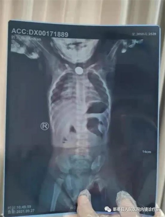 中新河南網(wǎng)駐馬店10月16日電(通訊員 沈琦)秦某之孫,1歲3月,于就診前3天誤食1枚1角硬幣來院,胸片提示卡在食管入口。