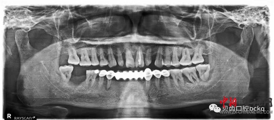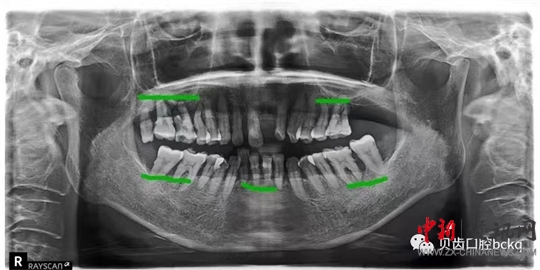 下面這兩張x光片是比較典型的牙周炎的影像資料。該患者的全口所有牙齒都出現(xiàn)了不同程度的松動(dòng)。患者現(xiàn)在感覺無法用牙齒咀嚼。坦白地講,牙周炎發(fā)展到這種程度,很多時(shí)候醫(yī)生也束手無策了。為了保留更多的牙槽骨,醫(yī)生回不得不拔掉哪些嚴(yán)重松動(dòng)的患牙。