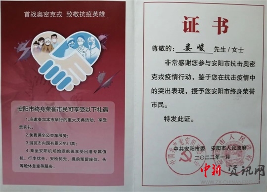鑒于婁峻在疫情防控工作中的突出表現(xiàn),中共安陽市委、市政府決定授予婁峻“安陽市終身榮譽(yù)市民”稱號(hào)。