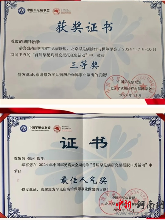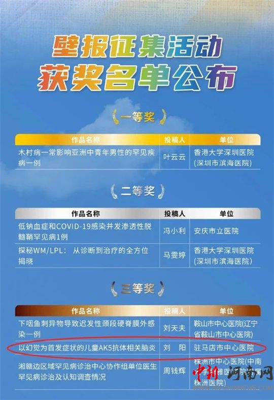 中新河南網(wǎng)駐馬店11月14日(通訊員:吳靖 李沐佳)在近日揭曉的第六屆中國罕見病大會“首屆罕見病研究壁報征集活動”中,駐馬店市中心醫(yī)院婦女兒童醫(yī)院兒內(nèi)三科劉陽醫(yī)生憑借其研究項目“以幻覺為首發(fā)癥狀的兒童AK5抗體相關(guān)腦炎”榮獲三等獎,該科張珂醫(yī)生榮獲脫口秀最佳人氣獎。