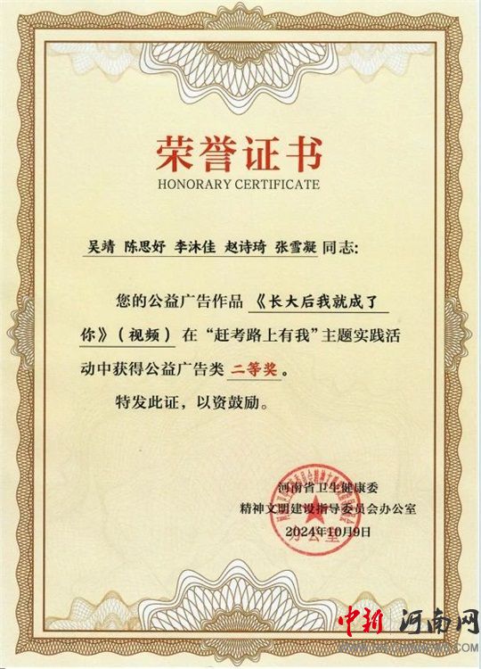 吳靖、陳思妤、李沐佳、趙詩琦、張雪凝共同創(chuàng)作的公益廣告《長大后我就成了你》榮獲公益廣告類二等獎(jiǎng);