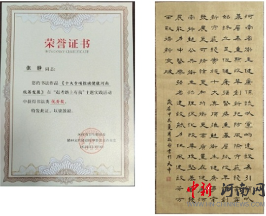 張靜創(chuàng)作的書法作品《十大專項(xiàng)推動(dòng)健康河南統(tǒng)籌發(fā)展》榮獲優(yōu)秀獎(jiǎng)。