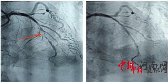 造影結(jié)果顯示,前降支中段次全閉塞。經(jīng)過充分預(yù)處理病變后,應(yīng)用一枚藥物球囊進行治療。隨后,患者癥狀明顯緩解,生命體征恢復(fù)平穩(wěn),送入重癥監(jiān)護室進行過渡觀察。