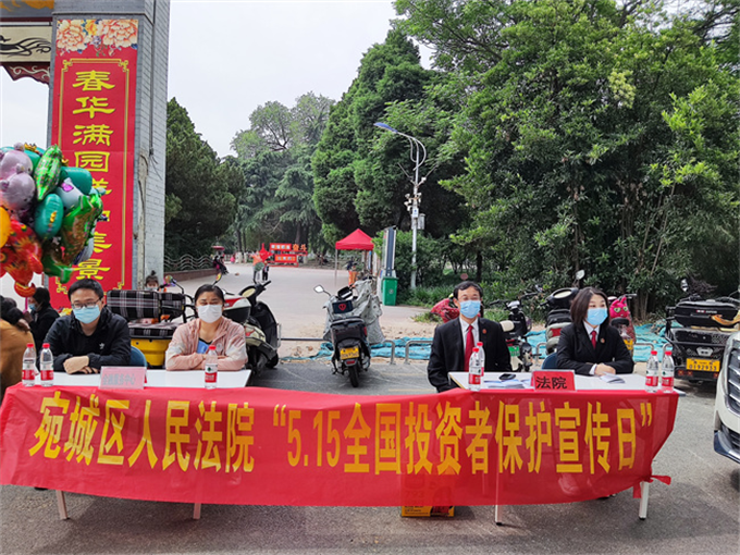 中新河南網(wǎng)5月15日電(李克選 謝叢晨 劉娟)為進(jìn)一步倡導(dǎo)理性投資文化和優(yōu)化法治化營(yíng)商環(huán)境,形成人人關(guān)心、關(guān)愛、關(guān)注中小投資者合法權(quán)益的良好氛圍,5月15日上午,以第四個(gè)“全國(guó)投資者保護(hù)宣傳日”為契機(jī),河南省南陽(yáng)市宛城區(qū)人民法院聯(lián)合區(qū)金融辦,在市人民公園北門開展《心系投資者 攜手共行動(dòng)——筑牢注冊(cè)制改革基礎(chǔ),保護(hù)投資者合法權(quán)益》主題宣傳活動(dòng)。
