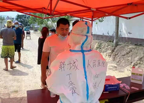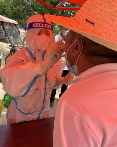 “在商丘的這幾日里,根據(jù)工作需要,不停地在轉(zhuǎn)換工作地點(diǎn),從虞城民安社區(qū)馬莊、丁樓到商丘市區(qū)建業(yè)香檳圣園、建業(yè)•公園里......工作中,一直要穿著密不通風(fēng)的防護(hù)服,熱的喘不過來氣,頭暈?zāi)垦!L貏e對居家隔離重點(diǎn)人群進(jìn)行核酸檢測采樣時(shí),手里提著消毒液等必備的東西,走步梯,還沒爬到樓上就渾身濕透,每一層樓都是在超越自己,挑戰(zhàn)自己的額體能極限。當(dāng)然,像我們隊(duì)長王坤,我的同事邢艷敏、郭浩、孫永立......每一位醫(yī)務(wù)工作者都是一樣的,都在克服一切困難勇敢向前。”