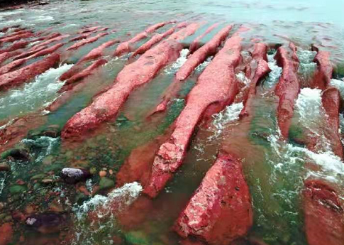 中新河南網(wǎng)10月14日電 受近期強(qiáng)降雨,河南省洛陽市嵩縣伊河田湖鎮(zhèn)段陸渾大橋附近的河道內(nèi)出現(xiàn)一片罕見的淺紅色石頭,這些“奇石”面積寬約80米、長約700米,帶有淺灰色圓斑,表面是參差不齊的溝壑。