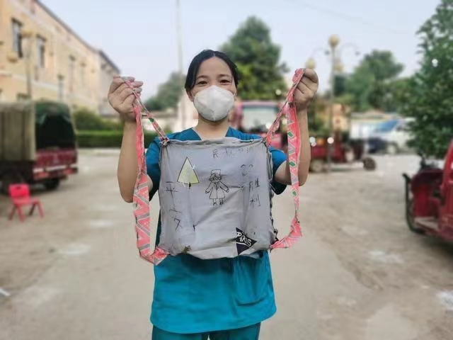 “降溫神器,小背包,是老莊村的志愿者和村民為我們準(zhǔn)備的,降溫效果不錯(cuò)!”李丹丹說,俺們這邊的志愿者,村民都可好,坐著小三輪,不讓多走一步,為了防暑降溫好多村民還都提前在家用礦泉水瓶提前凍好冰水放在背包里。