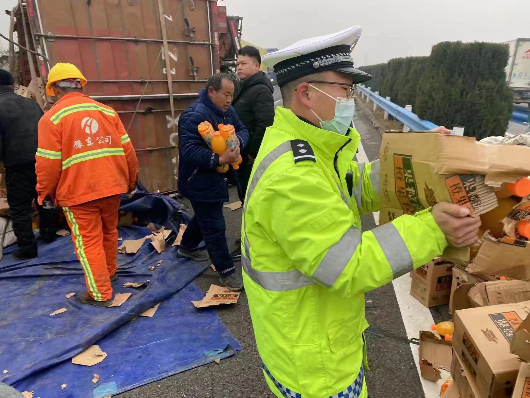 接警后,八中隊副中隊長王浩楠帶領(lǐng)中隊隊員火速趕赴現(xiàn)場,同時通知路政及救援車輛前來增援。民警到達現(xiàn)場后發(fā)現(xiàn),民警看到翻到在路面上,到處滾滿了飲料,如果不及時處置,存在著較大的交通隱患。此時,過往車流滾滾,飲料散落的到處都是,司機只要稍有不慎,極易發(fā)生二次事故。如何將這么多的飲料短時間內(nèi)收集轉(zhuǎn)運,減少車主的損失,快速恢復(fù)通行,迫在眉睫。民警當即安排巡邏車輛在后方做好警戒,對現(xiàn)場進行處置,避免二次事故的發(fā)生。
