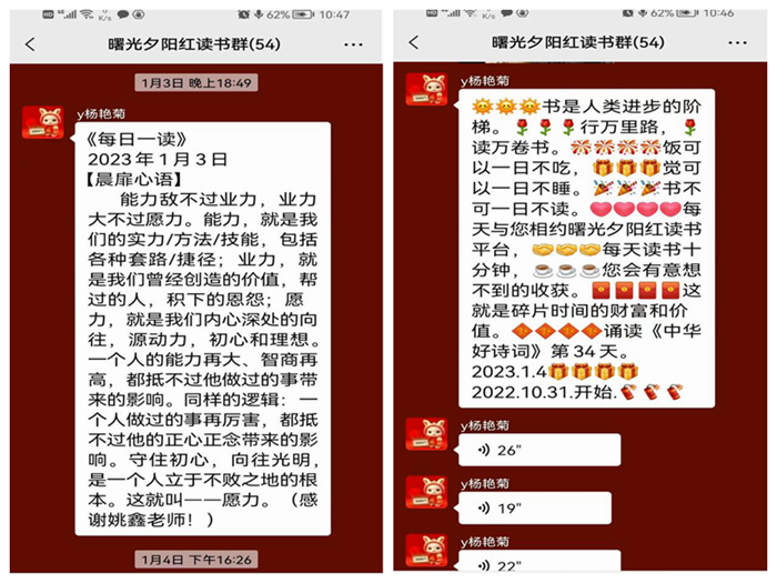 中新河南網(wǎng)3月7日電 安陽市北關(guān)區(qū)曙光辦事處老體協(xié)不斷創(chuàng)新文體活動(dòng)方式,建立了《曙光夕陽紅讀書群》,開展了適合所有老年朋友的微信打卡讀書活動(dòng)。很多老年朋友積極參與,特別是老體協(xié)執(zhí)行主席楊艷菊,不僅帶頭在群里誦讀《中華好詩詞》《習(xí)近平金句》《弟子規(guī)》《了凡四訓(xùn)》等傳統(tǒng)文化書籍,并且毎天在群里推送正能的《每日一讀》,活動(dòng)受到了老年朋們的一致好評(píng),特別是疫情封控期間,為大家單調(diào)的生活帶來了色彩。