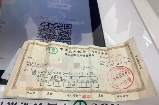 近日,該行一開(kāi)門(mén)就迎來(lái)一位戴著草帽的老先生,網(wǎng)點(diǎn)大堂客服經(jīng)理馬欣熱情地接待了他,詢(xún)問(wèn)老先生辦理什么業(yè)務(wù),老先生顫顫巍巍的從布袋里掏出一張陳舊微黃的紙張,接過(guò)來(lái)一看,是一張2001年手寫(xiě)的定期儲(chǔ)蓄存單(正常支取需查閱歷史檔案資料,且身份證信息保持一致),于是趕緊把內(nèi)勤行長(zhǎng)祁苗苗喊出來(lái)詢(xún)問(wèn)怎么辦理。