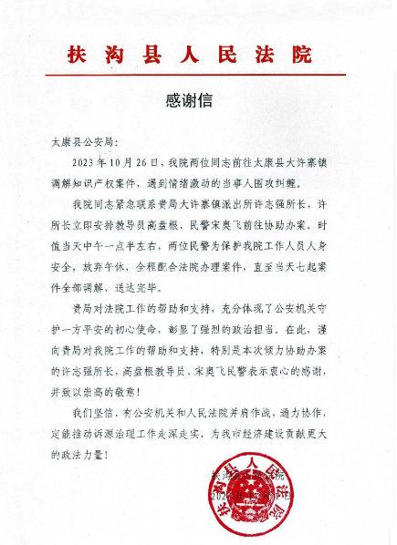據(jù)了解,10月26日,扶溝法院兩名同志前往太康縣大許寨鎮(zhèn)調(diào)解知識產(chǎn)權(quán)案件,遇到情緒激動的當事人圍攻糾纏。兩名法院同志緊急聯(lián)系太康縣公安局大許寨派出所尋求支援,該所許志強所長了解情況后立即安排教導(dǎo)員高盤根、民警宋奧飛前往協(xié)助辦案。時值當天中午一點半左右,兩位民警為保護法院工作人員人身安全,放棄午休,到事發(fā)地向不明真相的群眾進行普法宣講,并對圍堵的當事人進行批評教育,幫助法院同志解困。事后更是全程配合法院工作人員辦理案件,直至當天多起知識產(chǎn)權(quán)案件全部調(diào)解、送達完畢。