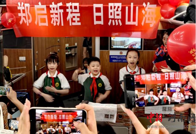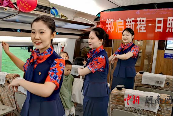 為了給旅客旅途增添歡樂,營造美好的乘車環(huán)境,該車隊精心布置了車廂,“坐上高鐵去日照,碧海金沙等你哦,朝飲胡辣湯午嘗海鮮宴,鄭州的城日照的海,一場說走就走得的浪漫。”旅客拍照打卡欣喜不止。