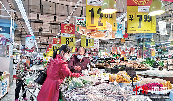在丹尼斯沁園店,記者看到,日常生活物資應(yīng)有盡有,肉、禽、魚(yú)、菜等一應(yīng)俱全,商家正忙著搬運(yùn)上貨、裝袋稱(chēng)重,不少市民正在選購(gòu)物品。