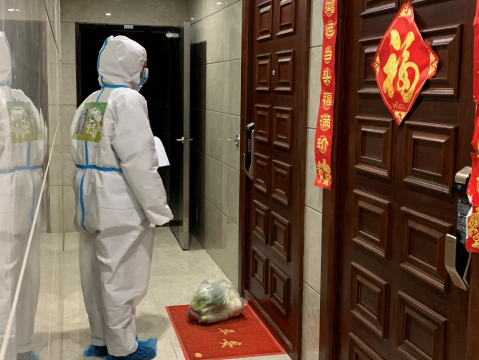 按照防疫政策要求,全體業(yè)主需居家隔離,物業(yè)工作人員將蔬菜打包消毒后,配送入戶。“我們敲門告訴業(yè)主蔬菜放在門口了,等我們走了業(yè)主才會(huì)開門把菜拿進(jìn)去。有的業(yè)主還會(huì)隔著走廊跟我們說謝謝,你們也要注意防護(hù)!聽見他們這樣說心里暖暖的,又酸酸的,希望疫情能趕快過去”負(fù)責(zé)上門送菜的安全主管胡建偉對(duì)記者說。
