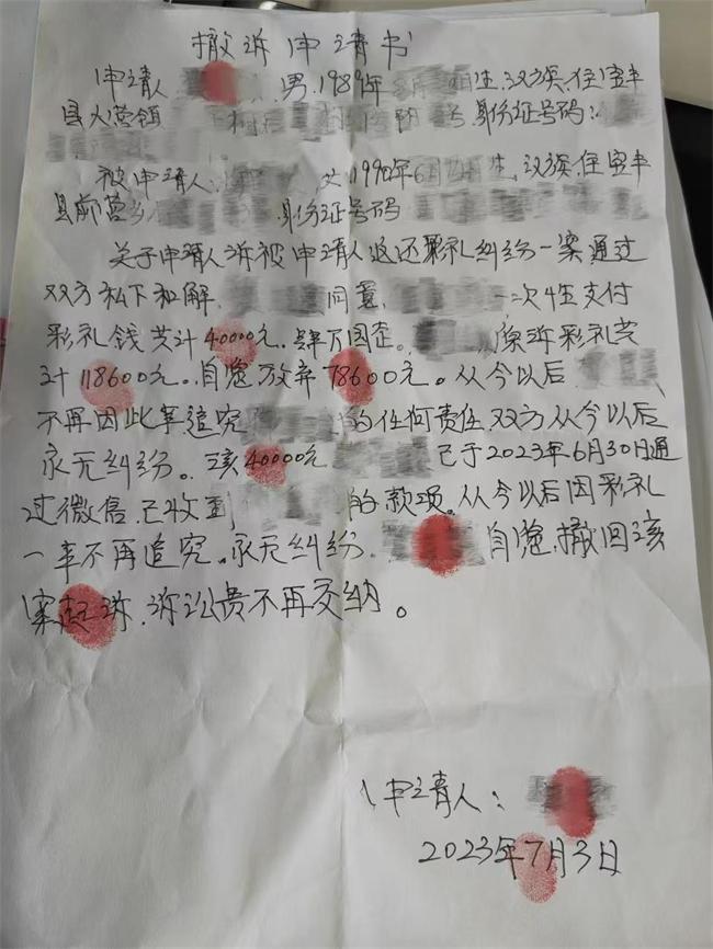 案件受理后,承辦法官與雙方幾番溝通,確認二人感情破裂、無和好可能情形后,從雙方交往情況、共同生活時間、來往轉賬明細、本地風俗習慣等方面綜合考量,向雙方釋法明理,充分講解民法典相關規(guī)定,促使雙方就返還彩禮數(shù)額達成一致。最終,被告王某向原告孫某返還彩禮款40000元、退還“三金”首飾,原告孫某申請撤訴,兩家矛盾就此化解。
