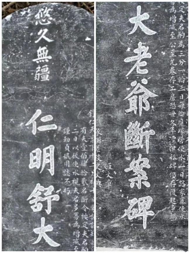 碑文分左中右三個(gè)部分,上下書寫、自右向左排列,中間字體較大:“悠久無疆仁明舒大老爺斷案碑”;右邊是主文,列明當(dāng)事人、案由及判決結(jié)果:“汝旁舊有重修渠一道魔塚營(yíng)路家寨兩村居民均食其利輪流灌溉毫無爭(zhēng)執(zhí)同治甲戌路家寨霸水偏澆七月間復(fù)又私捏碑文因控舒仁天案下十二月初十日蒙訊詰知此渠共夫貳伯零玖名魔塚營(yíng)現(xiàn)有夫陸拾柒名路家寨現(xiàn)有夫壹伯肆拾貳名斷令按定夫名酌為三分一輪三日每輪魔塚營(yíng)使水一日路家寨使水二日以後使水視夫名多寡為增減至公至允卷存工房恐世久年湮伊私碑仍存復(fù)起爭(zhēng)端謹(jǐn)勒貞瑉用誌不朽”;左邊是尾部,列明辦案者和時(shí)間:“承辦差役姬文章史文典焦泮大清同治拾叁年歲次甲戌十二月穀旦”。