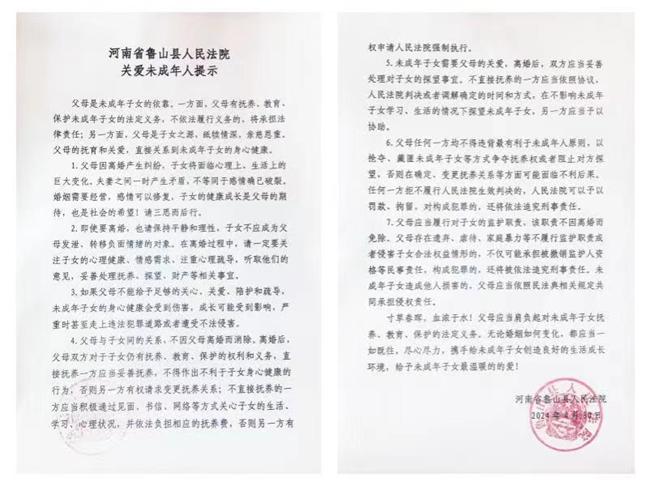 這是自4月15日最高人民法院發(fā)布《關(guān)于在涉及未成年子女的離婚案件中開展“關(guān)愛未成年人提示”工作的意見》后,魯山縣法院發(fā)出的首份《關(guān)愛未成年人提示》,著重保護未成年人合法權(quán)益,將關(guān)愛未成年人精神貫徹落實到案件辦理中。