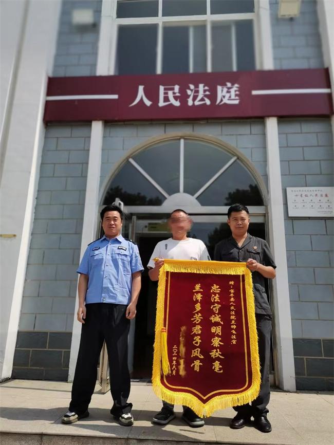 中新河南網(周亞飛)“非常感謝蘭法官,明察秋毫,幫我追回了貨款”。6月20日上午,當事人李某某專程來到寶豐縣人民法院鬧店人民法庭,將一面印有“忠法守誠明察秋毫蘭澤多芳君子風骨”的鮮紅錦旗,送到鬧店法庭員額法官蘭帥飛手中,對法院高效為民辦實事、解民憂的暖心舉措給予高度認可和誠摯的感謝。