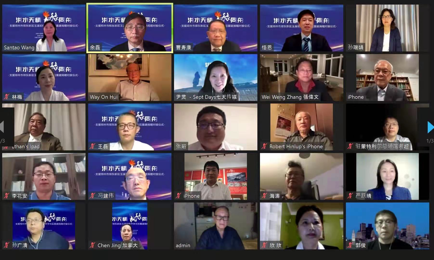 中新河南網(wǎng)訊(艾心)北京時間9月24日(蒙特利爾時間9月23日),支援鄭州市鄭東新區(qū)玉溪中學(xué)災(zāi)后重建捐贈對接儀式,通過視頻會議形式正式舉行,并同時進行直播。中華人民共和國駐蒙特利爾代總領(lǐng)事張珩先生、謝超領(lǐng)事,河南省人民政府僑務(wù)辦公室王潤玲處長、河南省僑聯(lián)邱建鋒部長、河南省慈善總會和占鶴副秘書長、鄭州市人民政府僑務(wù)辦公室侯翊佳處長、鄭東新區(qū)教文體局田國安局長、玉溪初級中學(xué)李花安校長,華總會、河南同鄉(xiāng)會、河南商會及蒙特利爾52個社團代表和僑胞代表出席了會議,6016人線上聆聽了會議。