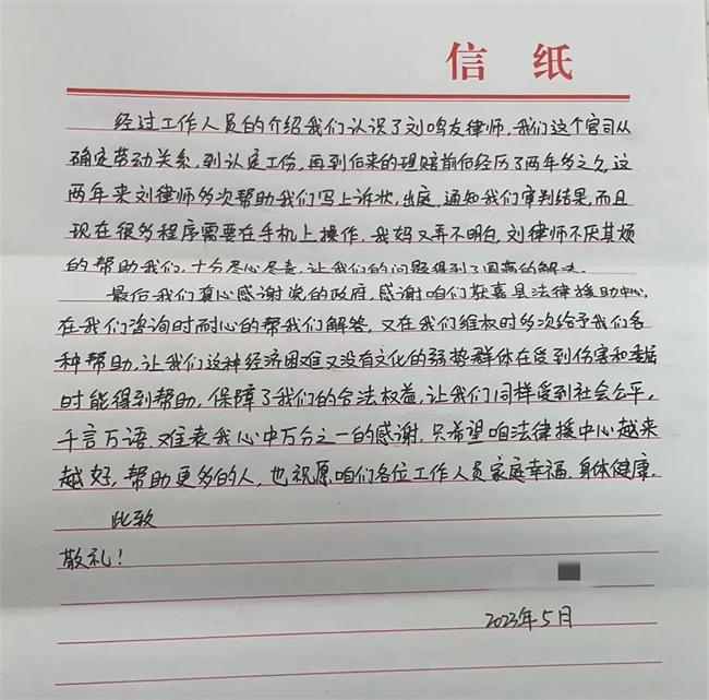 近日,獲嘉縣法律援助中心收到了來自受援人王女士的手寫信,信里字跡工整,字里行間透露著對(duì)法律援助律師最真摯的感謝。