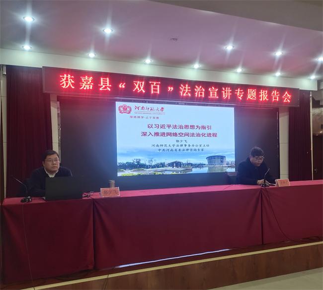 中新河南網(wǎng)(李力 郁成才)12月25日,新鄉(xiāng)獲嘉縣舉辦縣委理論學(xué)習(xí)中心組(擴大)集體學(xué)習(xí)暨“雙百”《深入推進網(wǎng)絡(luò)空間法治化進程》宣講報告會,特邀河南師范大學(xué)民法學(xué)博士、法理學(xué)博士后郭少飛副教授作專題報告?h委理論學(xué)習(xí)中心組成員,縣直有關(guān)單位,鄉(xiāng)(鎮(zhèn))主要負責(zé)同志共300余人參加。獲嘉縣委政法委書記張傳濤主持會議。