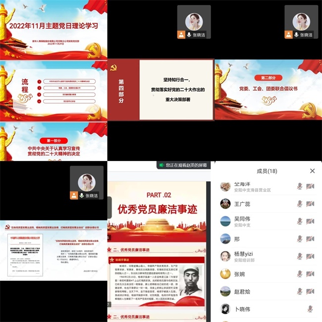 中新河南網(wǎng)11月30日電(趙平安)為深入學(xué)習(xí)貫徹黨的二十大精神,2022年11月29日上午,新華保險安陽中支黨支部組織召開11月主題黨日學(xué)習(xí)會議,全體黨員同志通過騰訊會議參會。