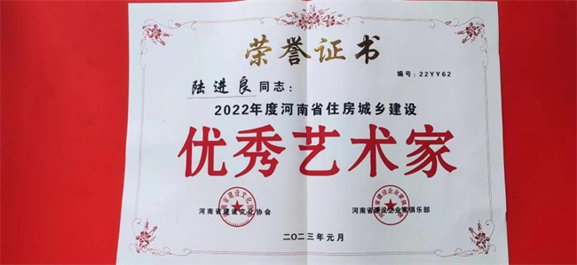 2023年2月3日,“雙擁劇場(chǎng)”燈光璀璨,河南省建設(shè)文化協(xié)會(huì)會(huì)長(zhǎng)黃海將“優(yōu)秀藝術(shù)家”榮譽(yù)證書,頒發(fā)給陸進(jìn)良。與此同時(shí),當(dāng)天其他受到表彰的人員,也被邀請(qǐng)上臺(tái)并合影留念。
