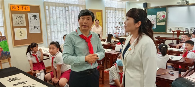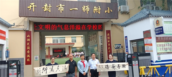 中新河南網(wǎng)(謝輝)漢字書法藝術(shù)是中華民族的瑰寶,行楷隸篆見功夫,墨香四溢校園香。開封市第一師范附屬小學(xué)為進(jìn)一步推進(jìn)素質(zhì)教育的全面實施,弘揚(yáng)中華優(yōu)秀傳統(tǒng)文化,培養(yǎng)學(xué)生書寫能力,提高文化品質(zhì)和審美能力,引導(dǎo)學(xué)生對中華漢字的認(rèn)同感,全力打造書香校園。2023年5月31日上午,一師附小開展以“書法傳承進(jìn)校園,翰墨飄香盡芬芳”為主題的書法名家進(jìn)校園活動。應(yīng)邀開封市教育書法研究會會長史根之帶領(lǐng)開封大學(xué)工會辦公室主任毛成利、副秘書長賈風(fēng)偉蒞臨我校參加此次活動。