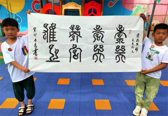 馬投澗鎮(zhèn)王二崗紅色文化合作社分別為他們送上書法作品"勇毅前行,碩果飄香。″鳥蟲篆,"崇尚英雄,天天向上。″龍安區(qū)文廣體旅游局龍圖街甲骨文書屋送上了設(shè)制的文化胸卡"學(xué)無止境″、"志存高遠(yuǎn)″。用文字祝賀和鼓勵兒童好好學(xué)習(xí),健康成長。