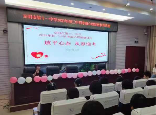 成長路上,鮮花相伴,風雨同行。為助力初三學子,激發(fā)潛能,減輕壓力,戰(zhàn)勝自我,實現(xiàn)超常發(fā)揮,圓夢中考,安陽市第十一中學在校領導的大力支持和劉文紅主任的積極籌備下,6月13日-6月14日下午在大會議室開展以“放平心態(tài),從容迎考”為主題的減壓賦能心理講座。