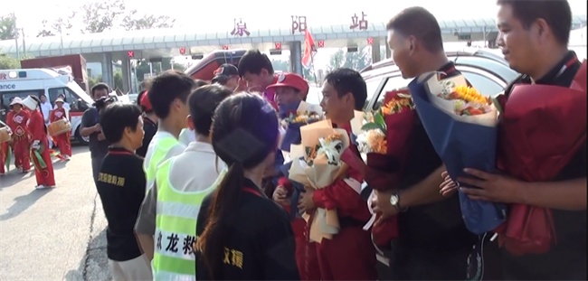 由社會(huì)各界組成的接隊(duì)代表和救援隊(duì)員家屬分別向救援英雄隊(duì)員們獻(xiàn)花,當(dāng)?shù)貞?yīng)急局領(lǐng)導(dǎo)代表主管部門致歡迎鼓勵(lì)詞,盤鼓隊(duì)、舞獅隊(duì)為凱旋歸來的救援英雄們進(jìn)行了精彩的表演。