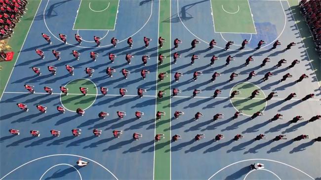 音樂響起,學生們精神抖擻、朝氣蓬勃,動作整齊劃一。揮臂,踢腿,彎腰,跳躍,用身體演出甲骨文字,一招一式都剛勁有力,舉手投足之間盡顯青春風采,讓古老的中華文字煥發(fā)出獨特的魅力。