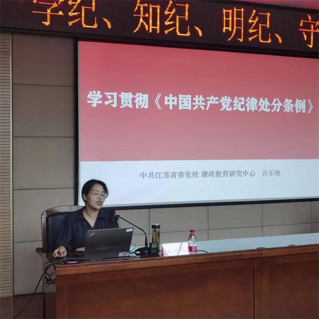 參觀完成后,黨員同志以黨課的形式共同對(duì)《條例》內(nèi)容進(jìn)行學(xué)習(xí),此次黨課由中共江蘇省委黨校廉政教育研究中心副主任、副教授,法學(xué)博士,碩士生導(dǎo)師孫樂(lè)艷進(jìn)行授課。課上孫教授從《條例》的修訂背景及歷史沿革、修訂的重大意義、新修訂《條例》的特點(diǎn)、貫徹《條例》的具體要求等方面對(duì)《條例》進(jìn)行了詳細(xì)剖析,引導(dǎo)黨員持續(xù)增強(qiáng)紀(jì)律意識(shí)、強(qiáng)化紀(jì)律執(zhí)行。