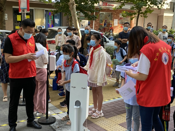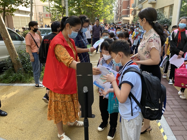 值周老師檢查學(xué)生們的防疫資料