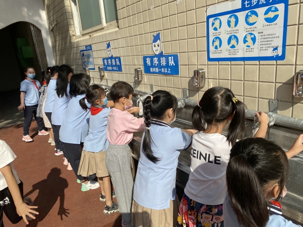 接著,各年級(jí)按照部署安排錯(cuò)時(shí)演練,在班主任的帶領(lǐng)下,按照各年級(jí)各班的規(guī)定路線下樓如廁、洗手,上樓,學(xué)生們熟悉著閉環(huán)路線流程,一米距離的班隊(duì)有序安靜。