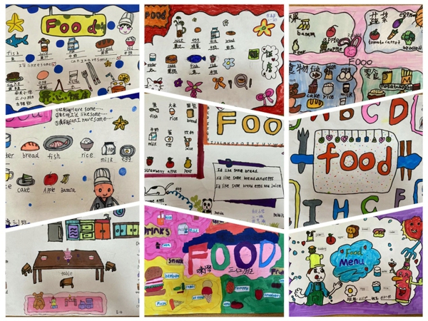 三年級同學(xué)們繪制以“food”為主題的手抄報,向大家展示了他們精心制作的美食菜單。他們精心設(shè)計,開動腦筋,不僅鞏固了本單元的基礎(chǔ)知識,還拓寬了英語文化視野。