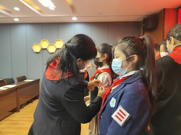 學(xué)校領(lǐng)導(dǎo)為新一屆大隊(duì)委員佩戴標(biāo)志