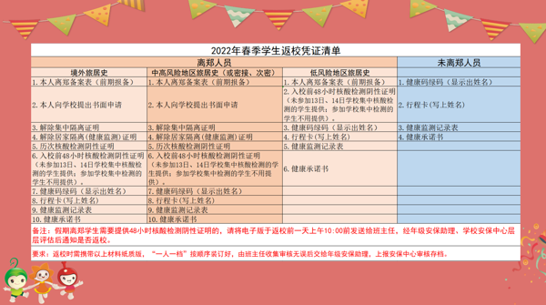 為確保開學平安、平安開學,對自己和他人負責,請各位家長查看《學生返校憑證清單》,根據(jù)個人情況如實準備好相關材料,按時間節(jié)點上交,材料務必準備齊全方可返校。