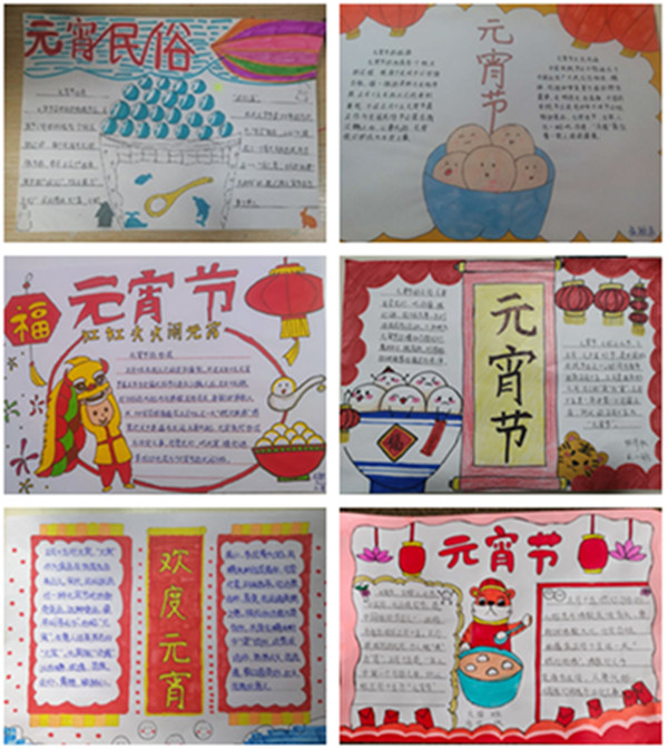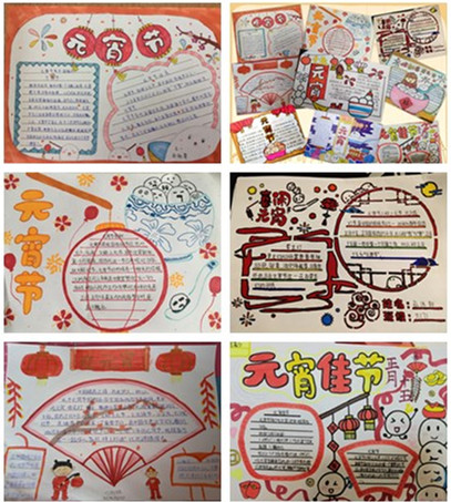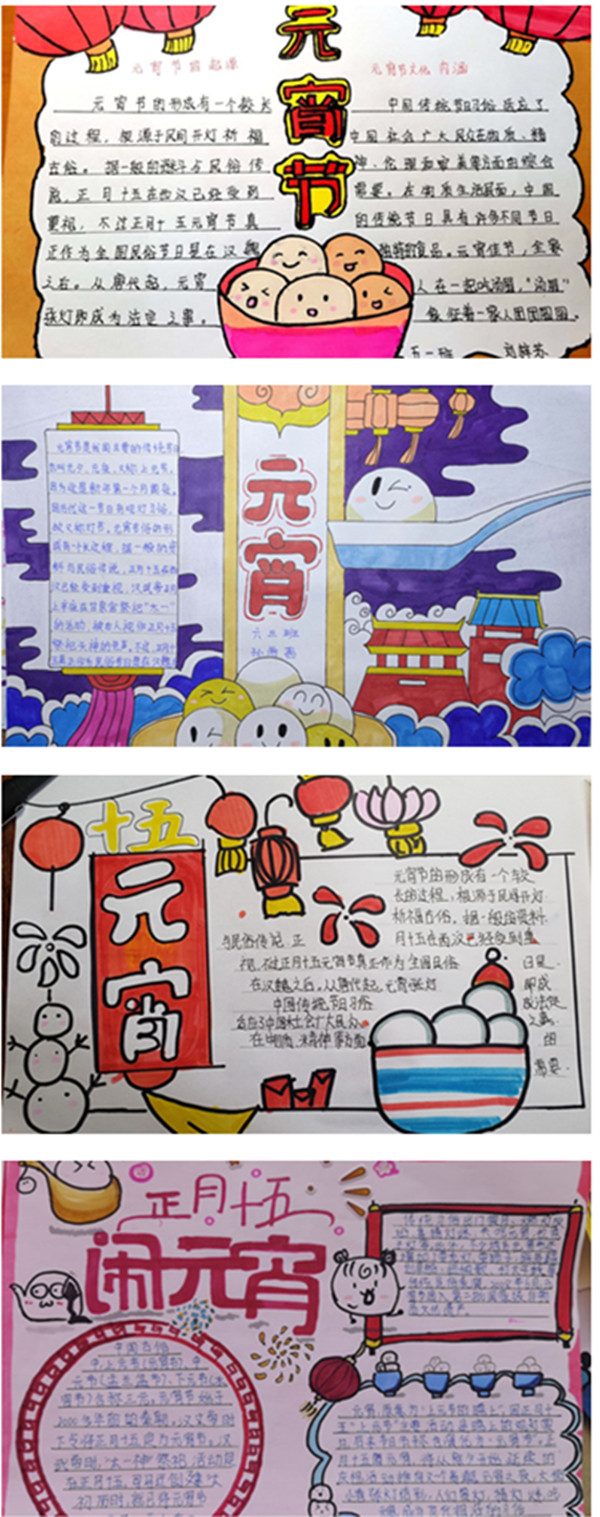 五、六年級的同學們通過電視、網絡、和家人交談、到社區(qū)實地調查等多種形式了解元宵節(jié)的來歷和風俗習慣。用一張張圖文并茂、內容豐富的手抄報,畫出了喜慶與團圓。一幅幅色彩絢爛、生動有趣的圖畫,營造了元宵佳節(jié)的熱鬧氛圍,展現了現在穩(wěn)定、祥和的幸福生活。