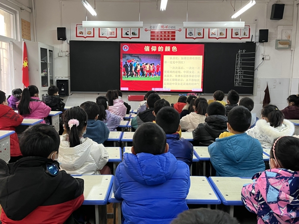 活動中,各中隊輔導(dǎo)員首先帶領(lǐng)隊員回顧黨的十九屆六中全會精神,又喜迎黨的二十大召開,堅定了隊員們?yōu)閷崿F(xiàn)第二個百年奮斗目標(biāo)的信心;緊接著,中隊輔導(dǎo)員們又緊密結(jié)合北京2022年冬奧會、冬殘奧會圓滿召開,引導(dǎo)隊員學(xué)習(xí)奧運(yùn)精神,感受中國歷史文化的底蘊(yùn),中國高超科技的魅力;結(jié)合中國女足亞洲杯奪冠,激勵隊員敢于拼搏、永不服輸、永不放棄,銘記信仰的顏色就是中國紅;最后,結(jié)合冬奧會奪金的谷愛凌、足球奪冠的女足隊長王珊珊等榜樣的故事,引導(dǎo)隊員們向榜樣學(xué)習(xí),樹立遠(yuǎn)大理想,勇做追夢人,為實現(xiàn)中華民族偉大復(fù)興的中國夢而奮斗。